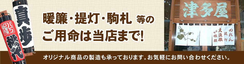 当店は、暖簾(のれん)・半纏(はんてん)・千社額(せんしゃがく)をはじめとする江戸情緒あふれる各種商品を取り扱っております。 店舗様、学校、スポーツ大会、サークル向けなど、幅広い用途でお使いいただける既製品以外の名入れ別注(オリジナル)商品も作成いたします。